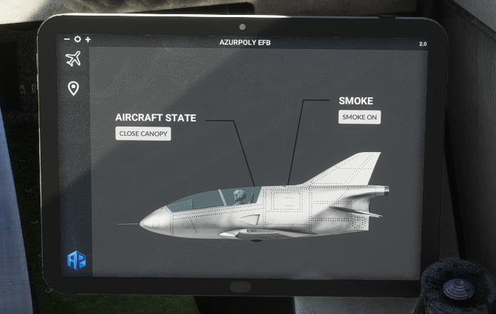 This menu has two buttons, one for opening and closing aircraft canopy, the other to switch on/off white smoke.
