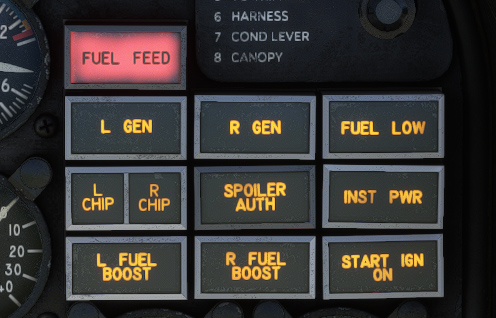 | Fuel low caution | Amber | Less than 225 pounds of fuel in center wing tank |