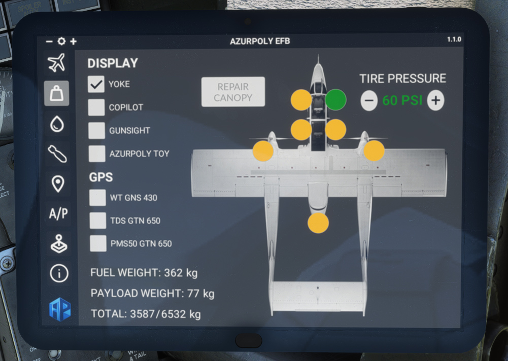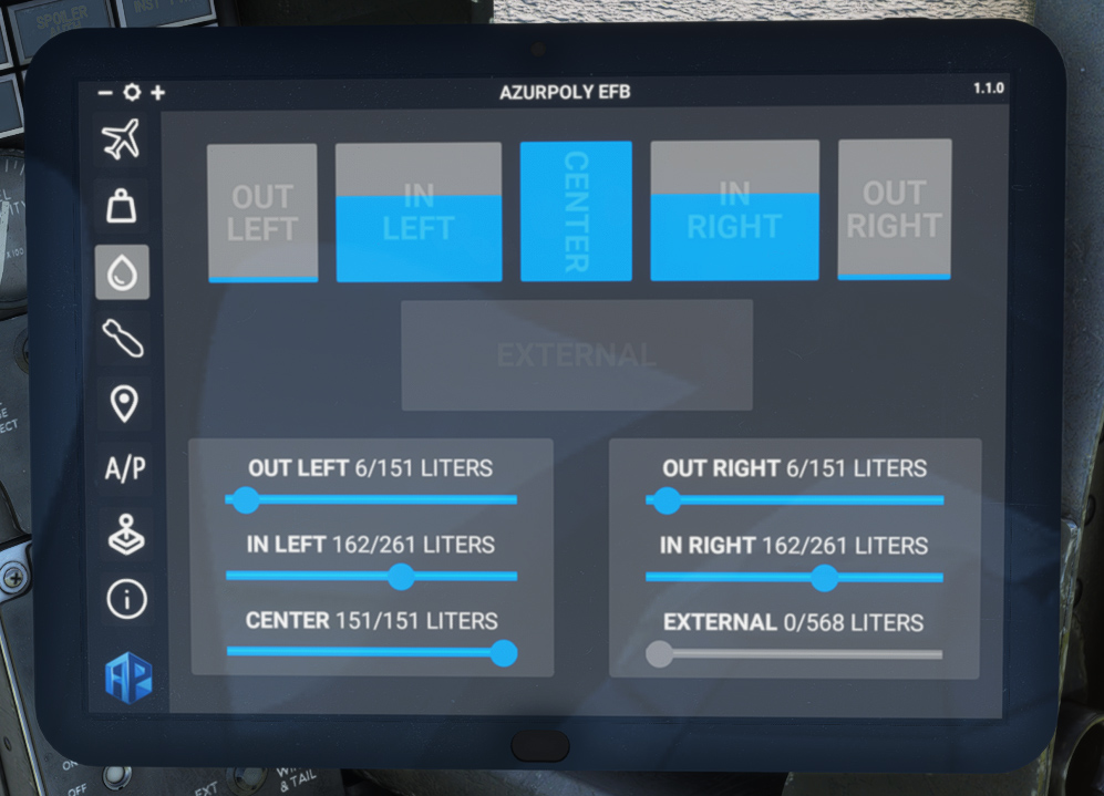 This page shows fuel quantity in each of the five internal tanks plus in external tank, where you can use sliders to update quantity directly. You can achieve the same by using default fuel menu.