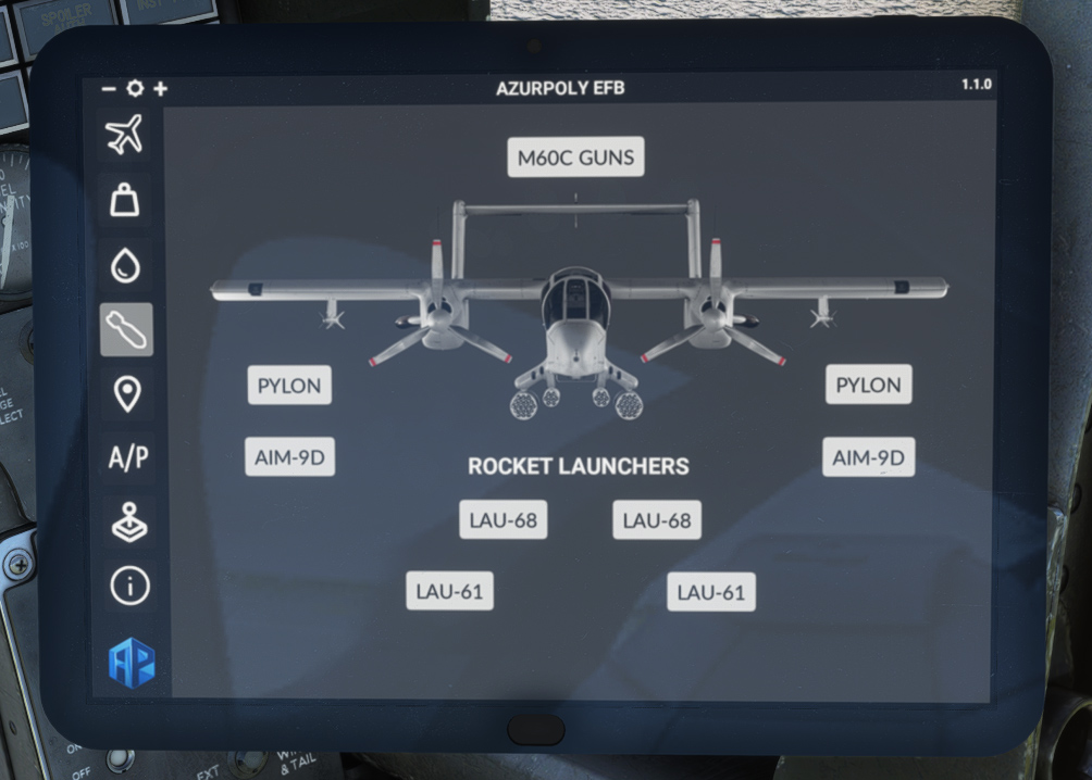 This menu is available if you are flying the OV-10A variant (OV-10B does not carry weapons).