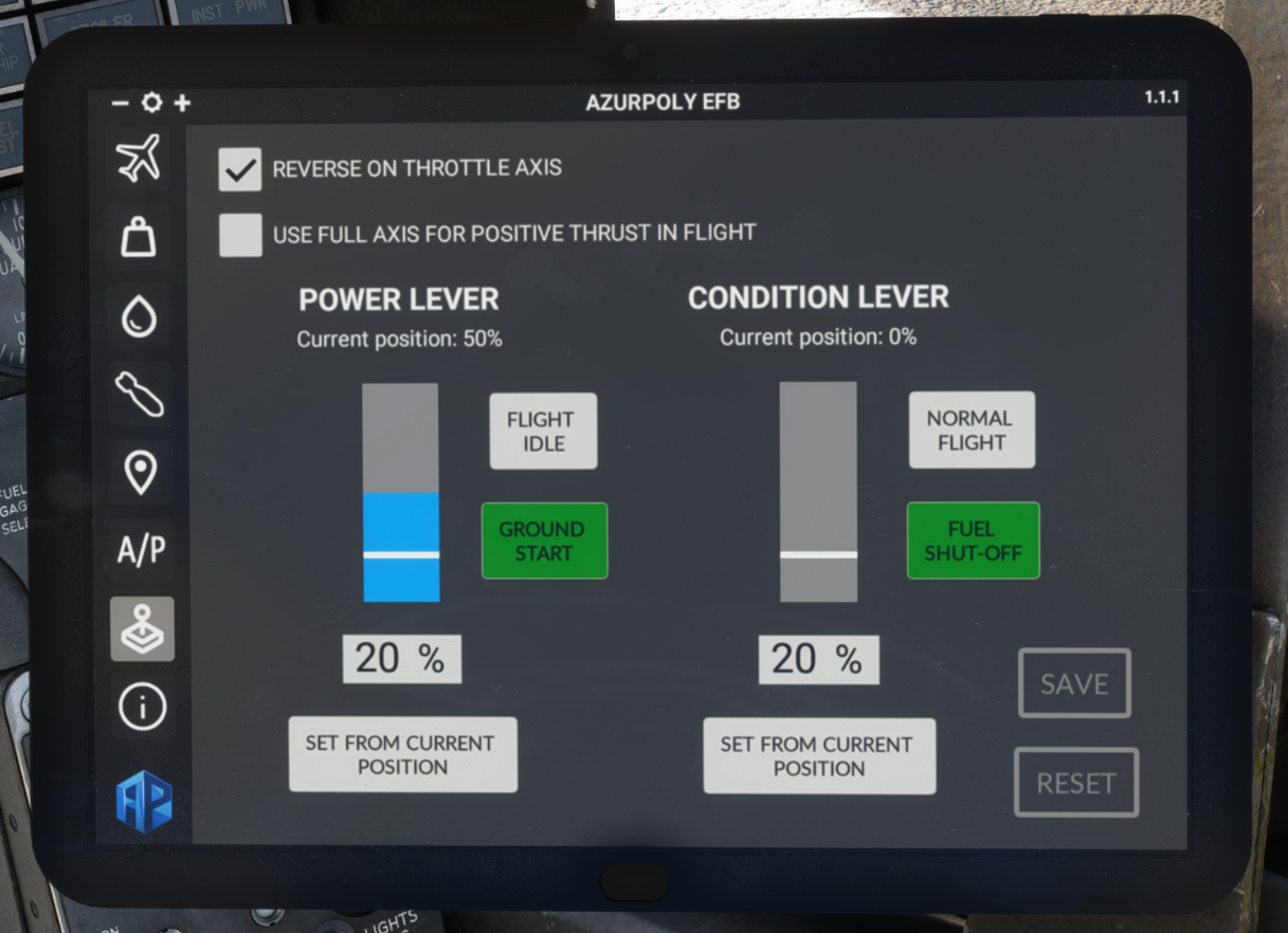 If condition levers are bound to an axis, you can also set NORMAL FLIGHT and FUEL SHUT-OFF positions on the axis.