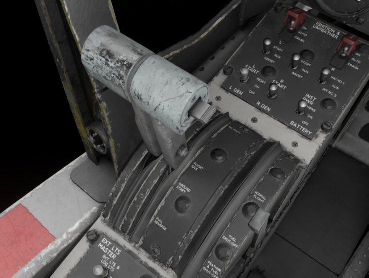 START switches are used on ground to engage engine start sequence. Those three-position switches are marked START, RUN, and ABORT, and return to RUN position on release. Holding the switch momentarily in START position initiates engine starter operation. ABORT position disengages the holding circuit, disables automatic ignition circuit and the starter.