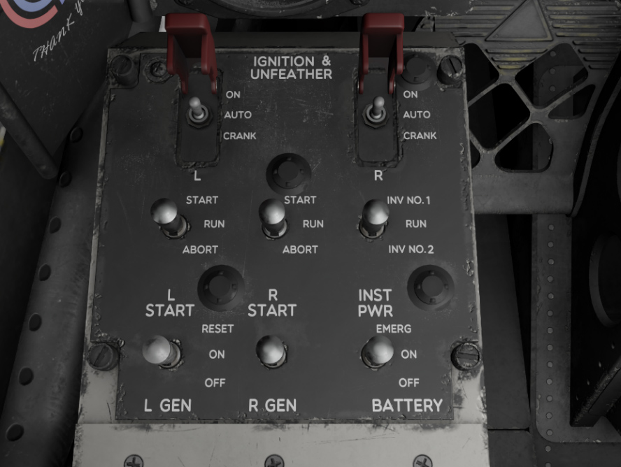 IGNITION & UNFEATHER switches are used to operate propeller unfeathering pumps and for air start. AUTO is their default position. CRANK will turn unfeather pump on, supplying oil pressure to the propeller governor and setting propeller angle within the beta range. When used in flight, propeller will start windmilling due to the drag they produce. ON position also triggers unfeather pump, but fuel is introduced for an air-start along with ignition.