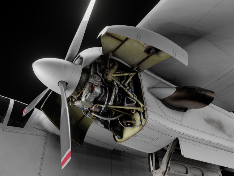 Each engine drives a 8.5 feet, three-blade, fully reversible aluminum propeller. At maximum engine RPM (41,730), propeller rotates at 2000 RPM. Propeller pitch is adjusted by varying the oil pressure in the propeller dome, meaning it will automatically feather when engine is shut down, as oil pressure will be lost.