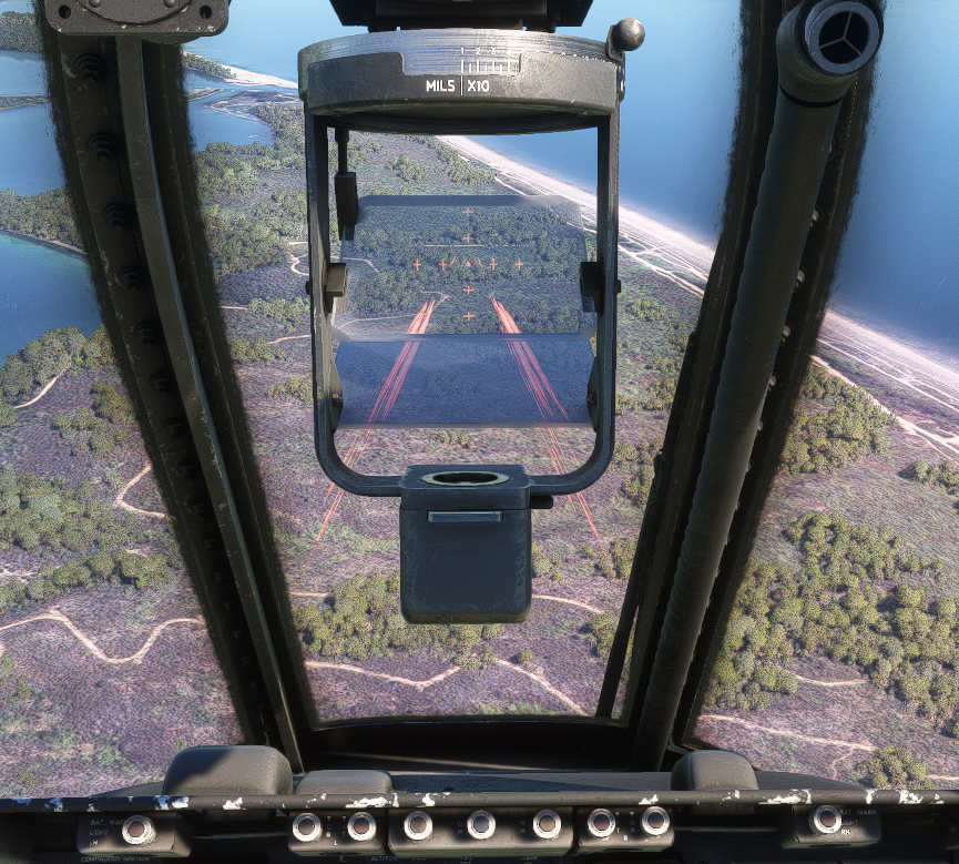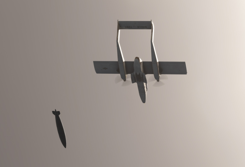 The Bronco is capable of carrying varied conventional munition loads, including general purpose bombs, rocket packages, fire bombs, etc. Machine guns are functional in our model but all other weapons cannot be fired for now (planned in future updates).