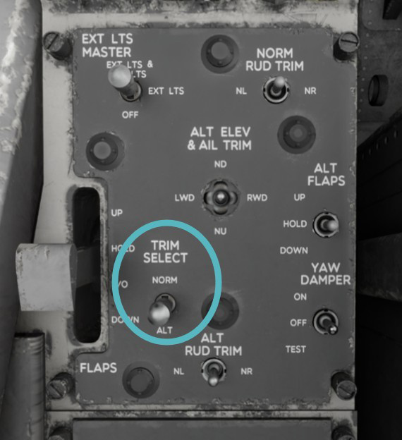 TRIM SELECT switch is positioned next to the flap handle. In the NORM position, primary DC bus power is allocated for aileron and elevator trim, regulated by the stick grip trim switch, and for rudder trim through the NORM RUD TRIM switch (panel-mounted), as described previously.