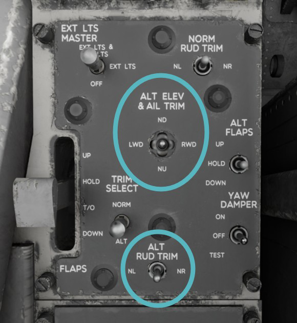 Switching to ALT position engages an alternate primary DC bus power source, and trim adjustments are made using the alternate elevator and aileron trim, as well as the alternate rudder trim switches.