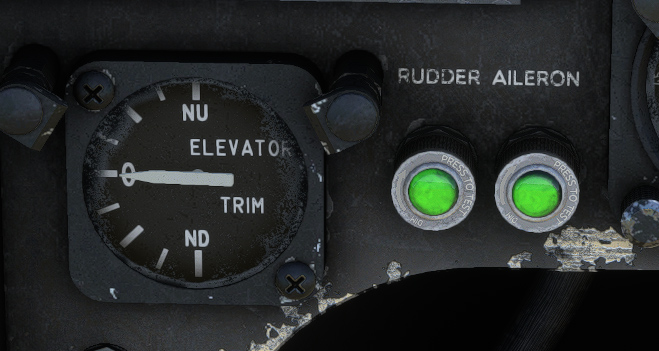 Aileron and rudder trim neutral lights are installed on main instrument panel. Those green, press-to-test lights, powered by the primary DC bus, indicate neutral position for roll and yaw trim.