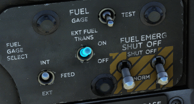 Fuel is transferred from the external tank to the wing center/feed tank by an electrically driven transfer pump in the external fuel transfer line. It is manually switched on using EXT FUEL TRANS switch. Normal rate of transfer from the external tank is 750 pounds per hour (115 GPH). Fuel is transferred to the center tank, and may flow to inboard/outboard tanks if center tank is full already.