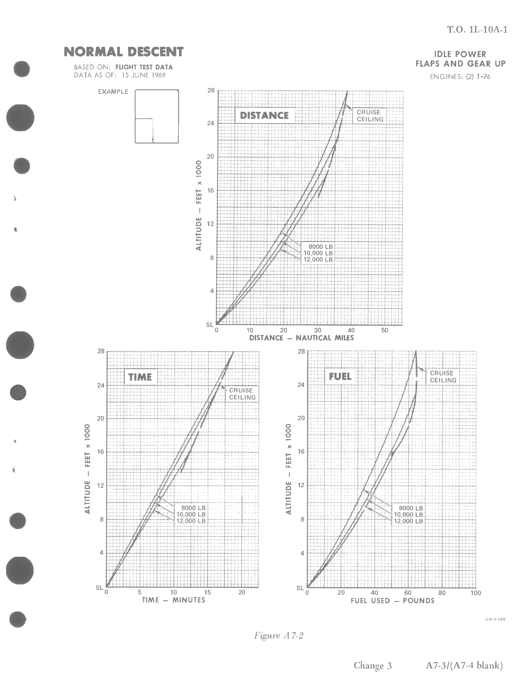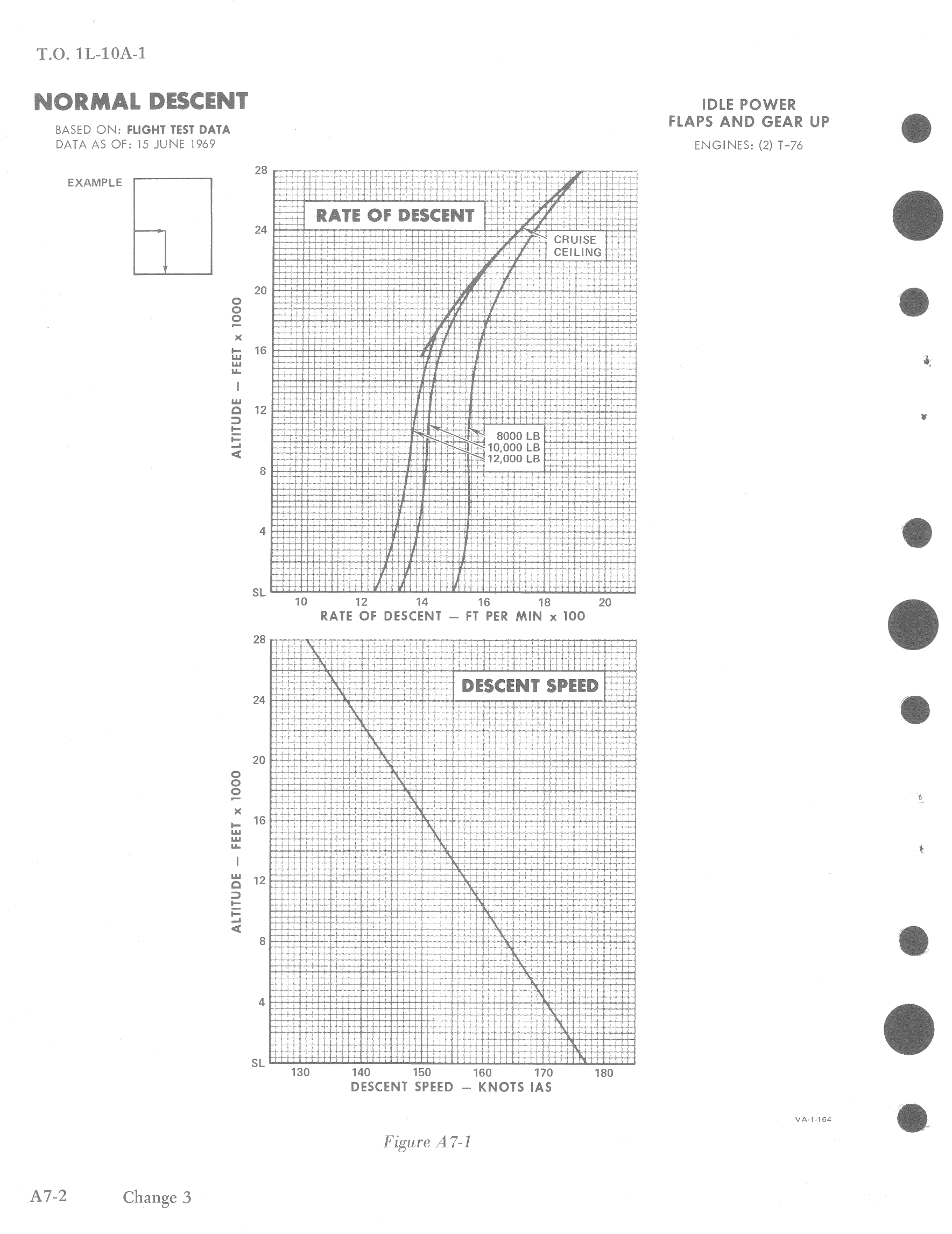 Descent data depicts the maximum nautical miles per pound of fuel obtainable during operational descents from altitude down to the landing pattern or target area. Rate of descend and descent speed during a normal descent are determined with both engines at idle power.