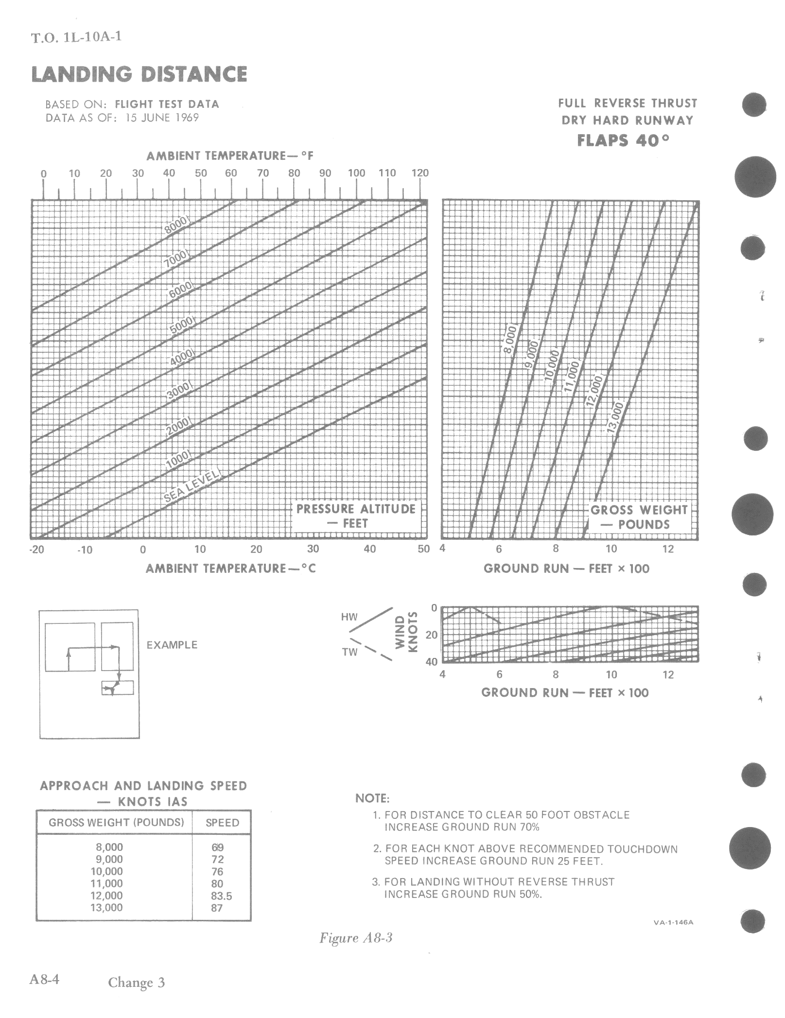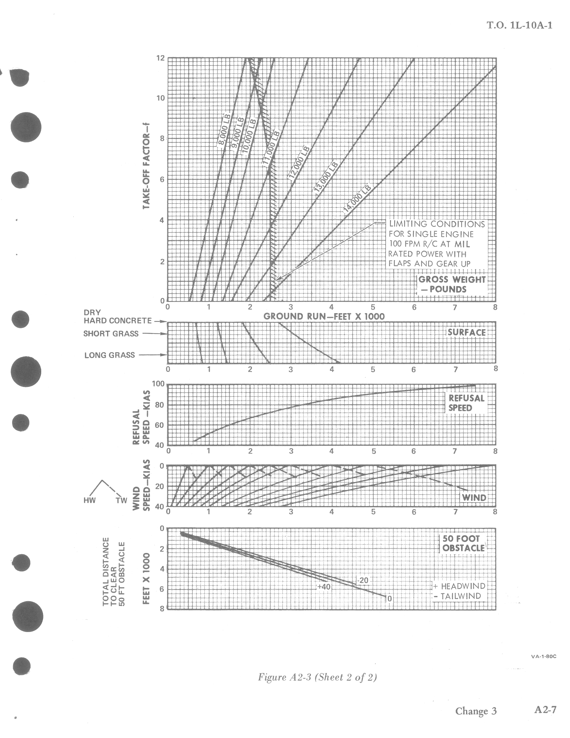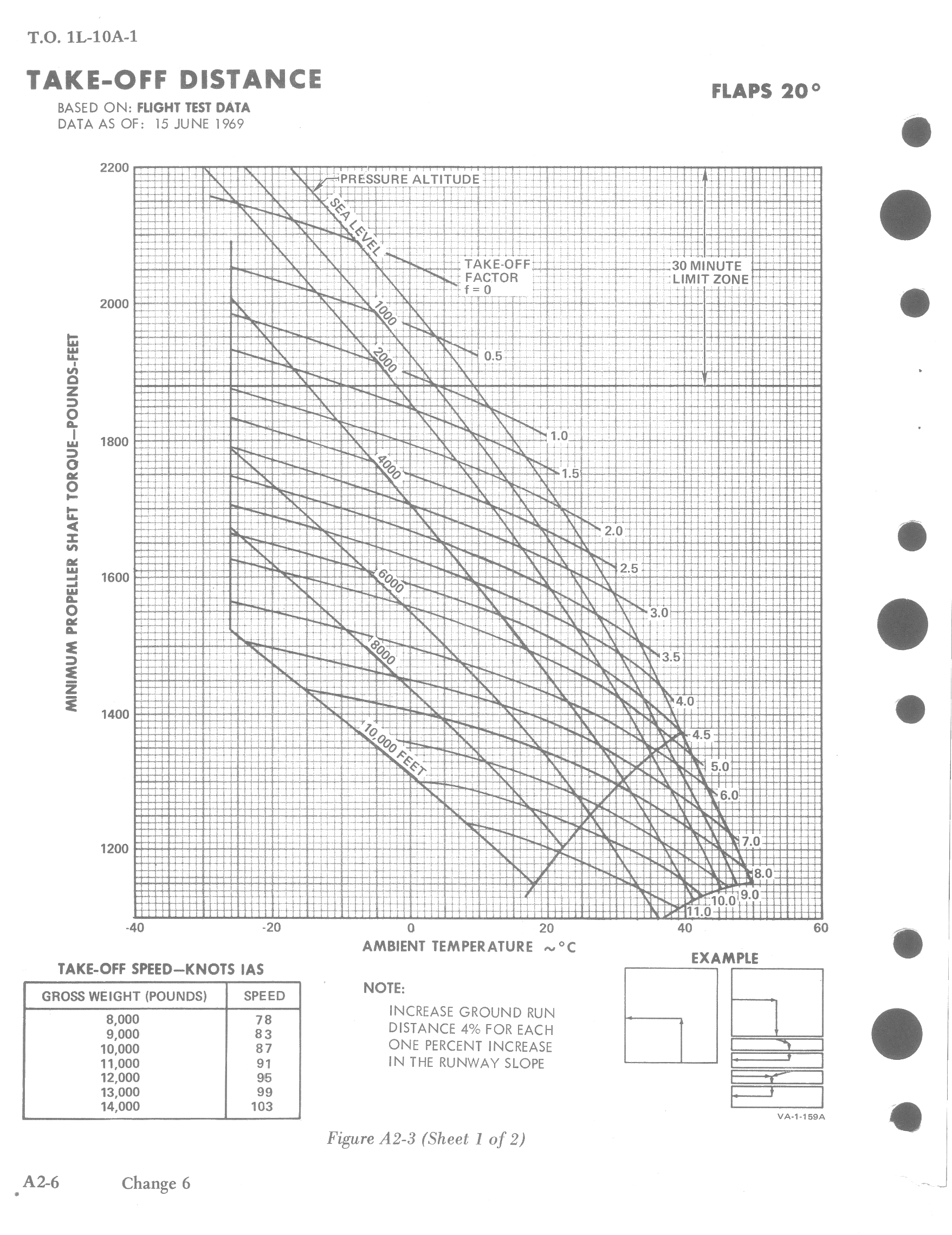 The take-off distance charts provide a means of determining take-off distance under normal or STOL operating conditions, with 20 degrees of flaps. The charts present expected torque, refusal speeds, take-off speeds, ground run distance for various types of runways, with various wind conditions.