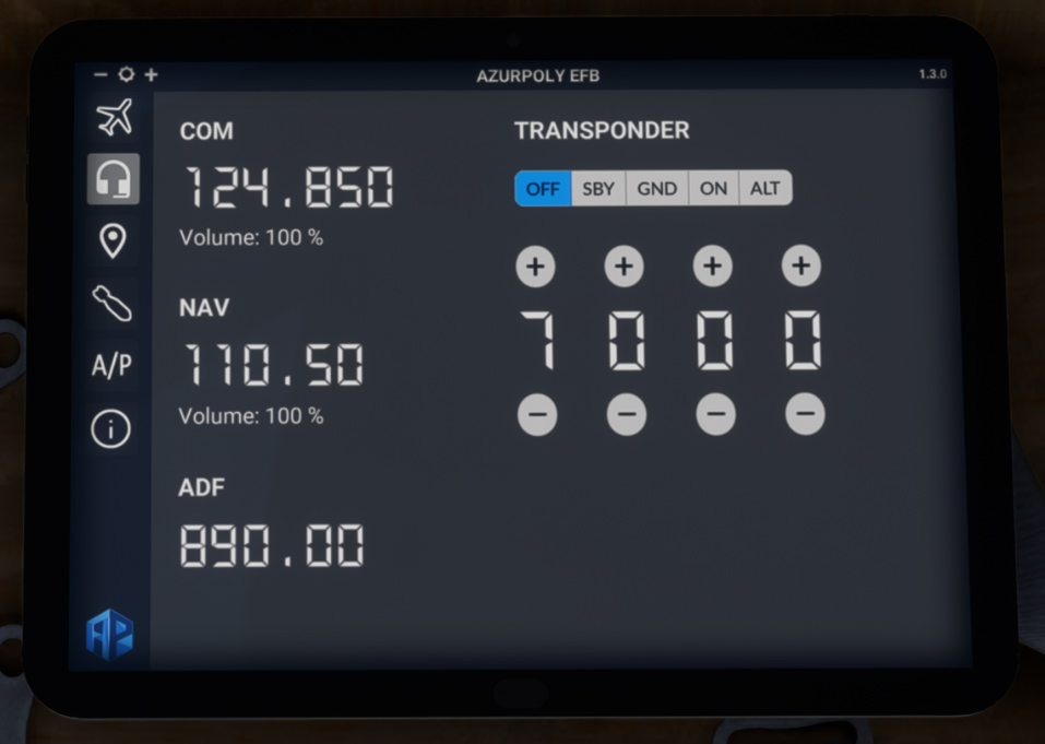 As there is no transponder unit in the cockpit, you can also use this menu to set transponder state and code.
