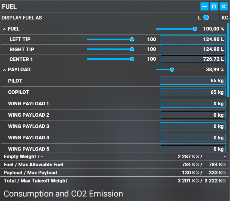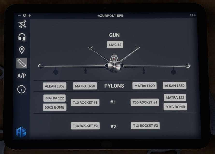 From version 1.1, you can display various weapons on the aircraft from this EFB menu. Those weapons are static and cannot be jettisoned.