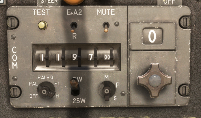 V/UHF panel (called COM in our aircraft) is used for communications in VHF and UHF. It is powered with the bottom left knob on “PAL” position.