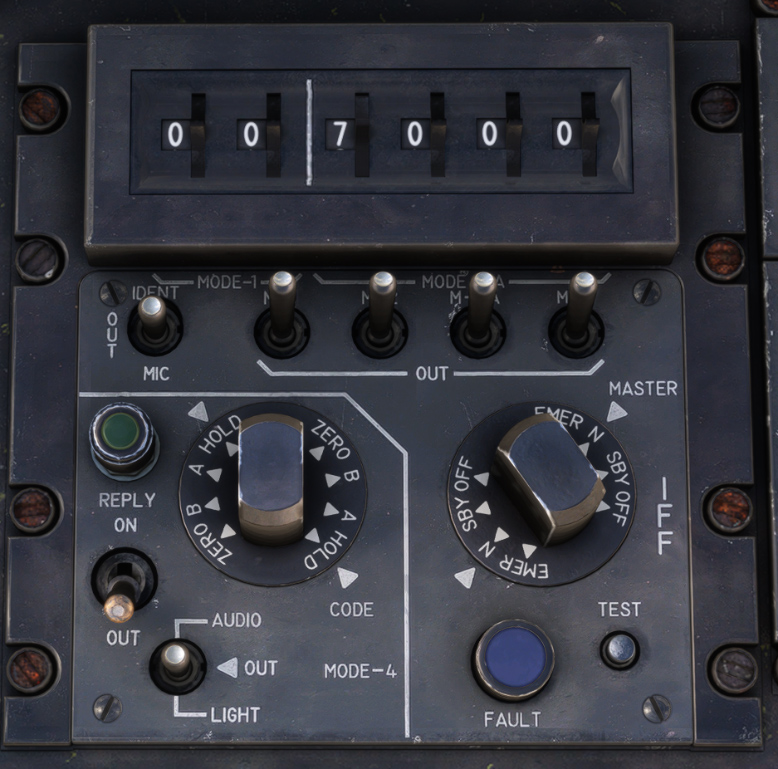 As IFF (identification, friend or foe) does not have any usage within the simulator, this panel is simplified and only used to manage aircraft transponder, with: