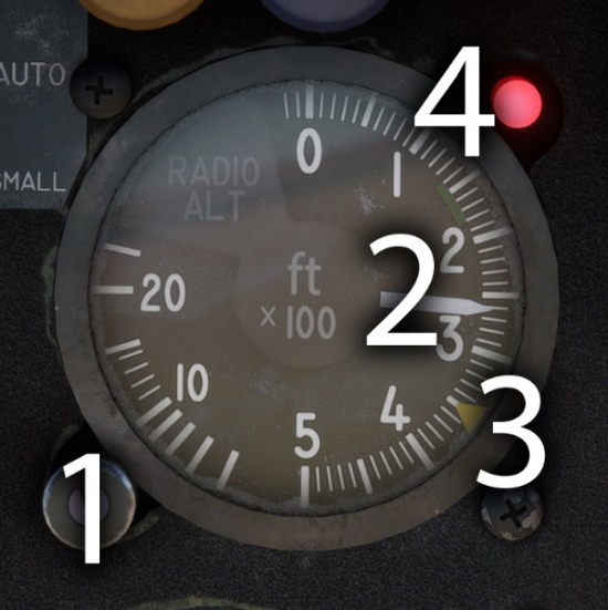 Mounted on the instruments panel, the indicator shows radar altitude, from 0 to 2500 feet, with a logarithmic scale from 500 feet.