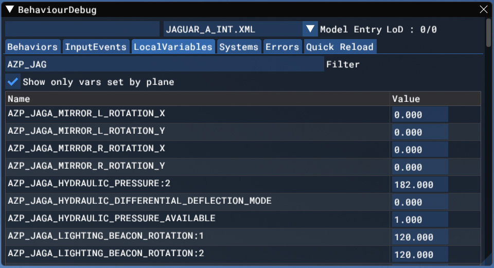 In order to see custom variables related to the aircraft, you need to enable Developer mode (general options) and go to Tools > Behaviors > Local Variables on top menu bar. All custom variables are prefixed with “AZP_JAG” keyword.