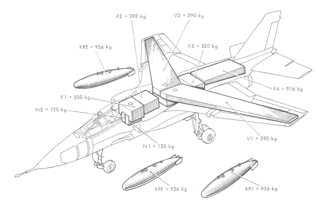 The aircraft can carry up to three external tanks (one on the belly, one below each wing).