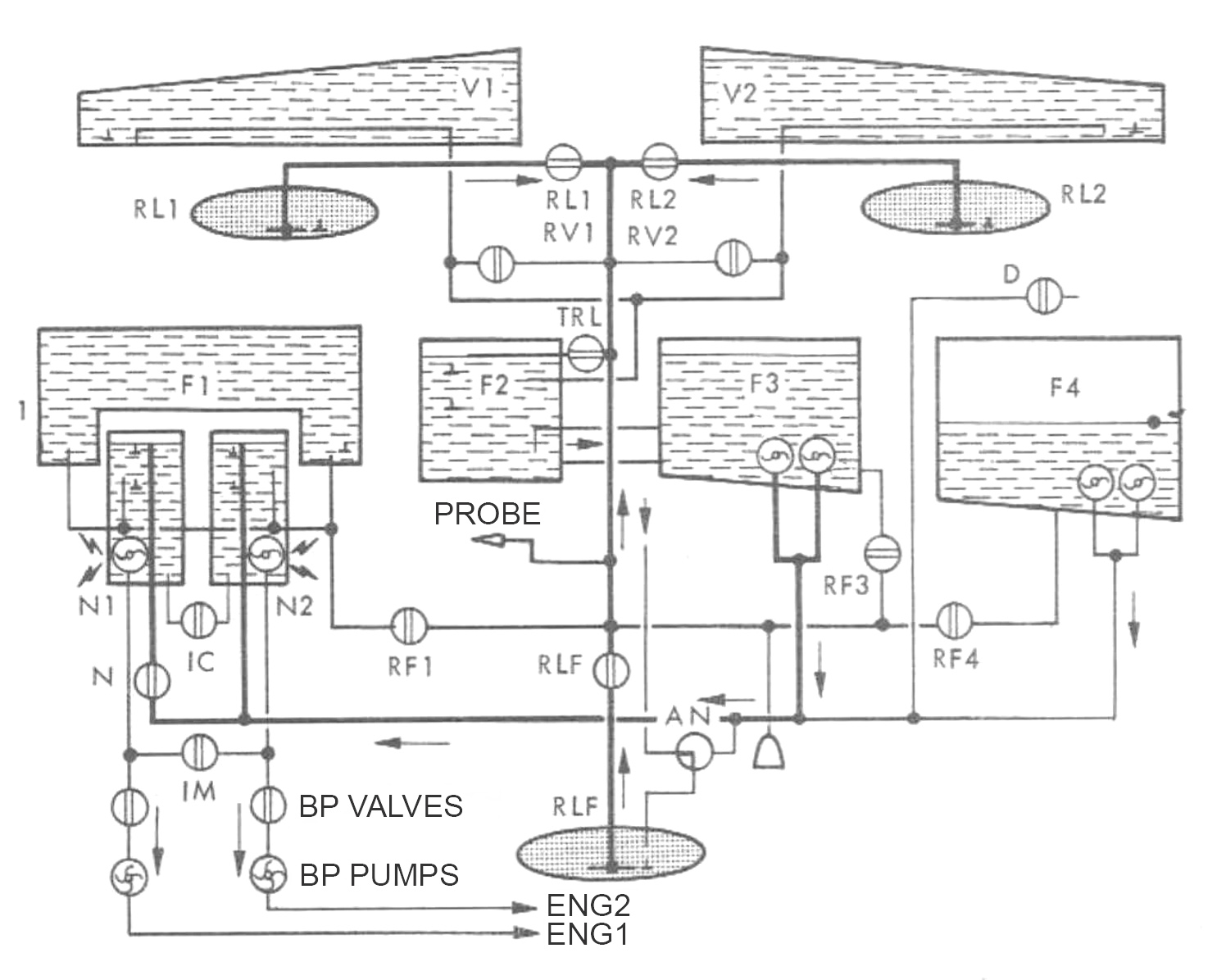 All tanks (except N1, N2, F2/F3 and F4 which enclose transfer pumps) are pressurized with air taken from the engines.