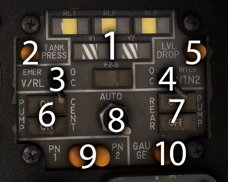 | 1 | Fuel tanks level indicator (three states) | 6 | F3 pumps active |