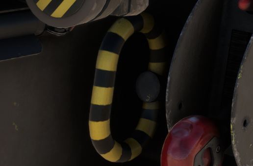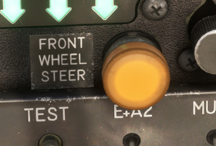Nose wheel steering is enabled by default and requires hydraulic power to function. The nose wheel can be steered via the rudder pedals, with a maximum deflection of ±55°.