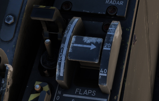 Flap control is managed via a lever on the left side console, with five selectable positions: