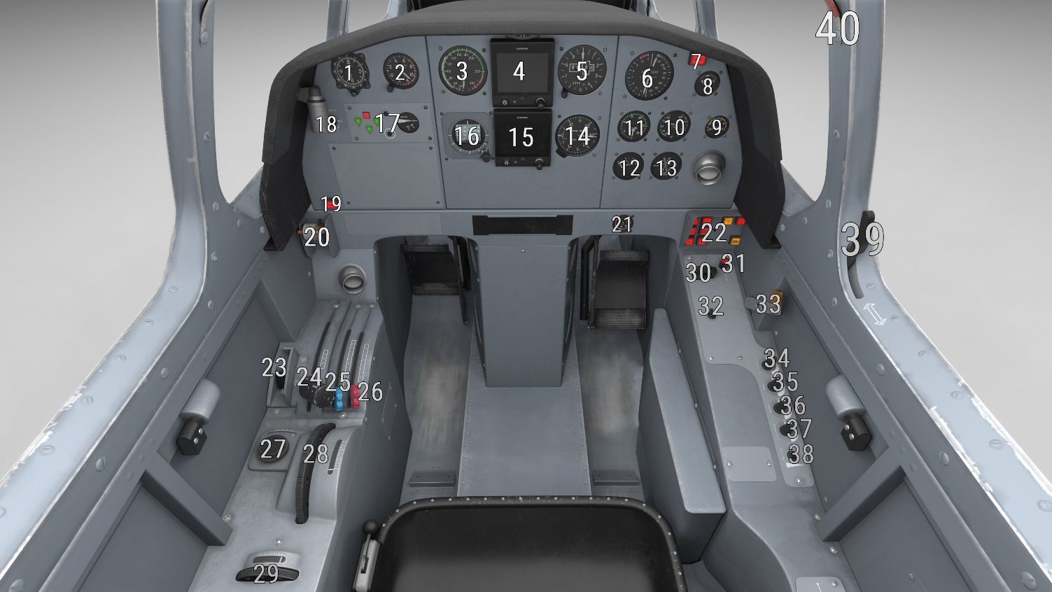 | 5 | G5 PFD (slip ball above) | 38 | Propeller lever |