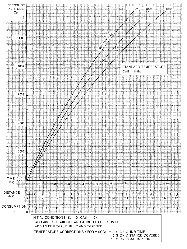 Climbs are performed full throttle, full low pitch, with nil slope and side-slip, for CAS = 110 kts and in clean configuration.