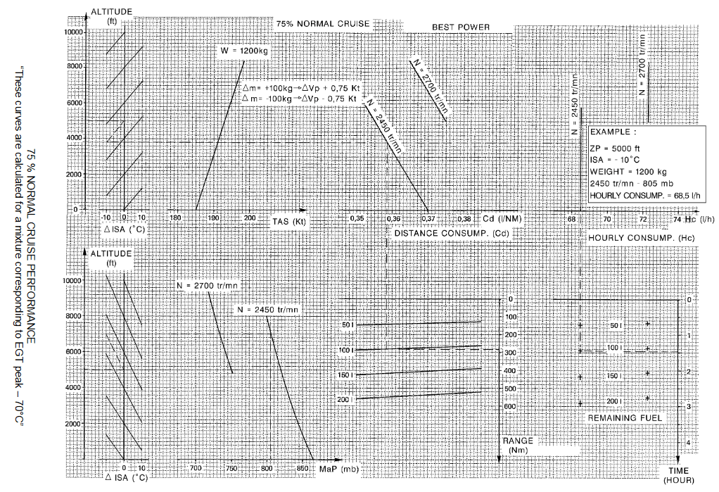Power 75% “normal cruise” (2450 tr/min, adapted Pa), mixture best power (EGT peak – 70 °C) as done by automatic mixture control already.