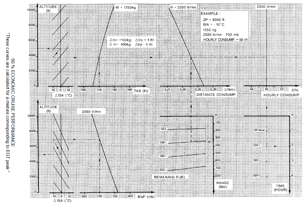 Power 60% “economic cruise” (2350 tr/min, adapted Pa), mixture manually set to EGT peak.