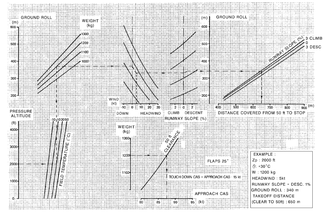 These performances are established on dry, hard surface runway, with approach and touch-down impact speeds, depending on aircraft weight, given by the graph on this same figure.