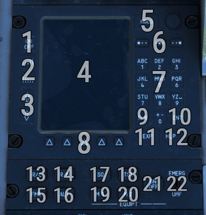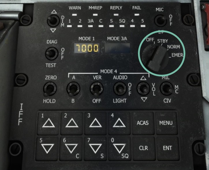 A complex military Identification Friend or Foe (IFF) is located on center console. For simulation purpose, only mode S (transponder) is implemented, as other military functionalities do not have any usage in the simulator.