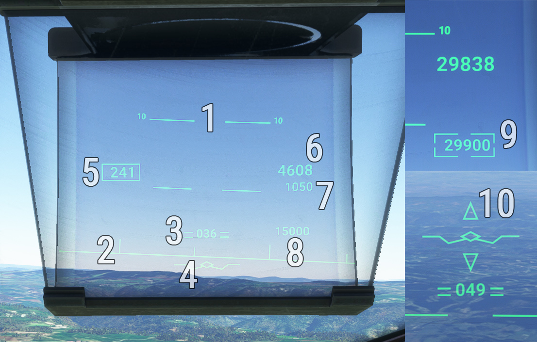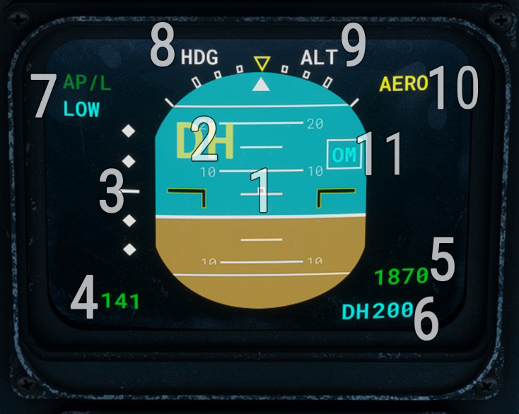| 2 | Horizon line (vertical bar for each 5° heading) | 7 | Radio altitude (displayed below 2500 ft) |