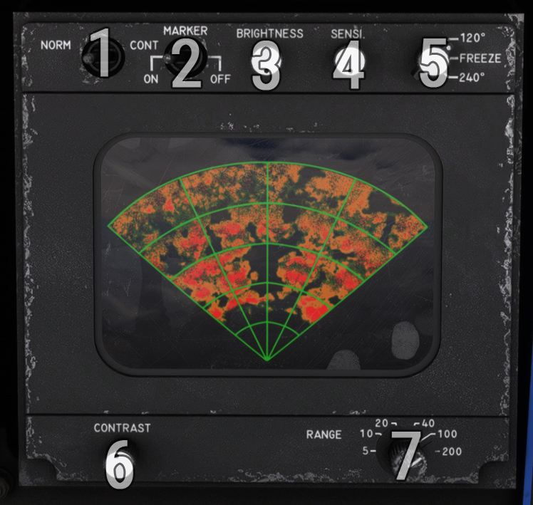| 3 | Light knob (inoperative) | 7 | Radar/beacon mode (inoperative) |