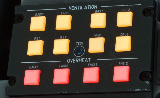 Last row is composed of red lights that will glow if one of the EADI or EHSI units are overheating.