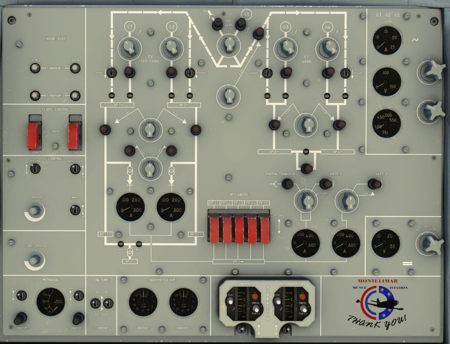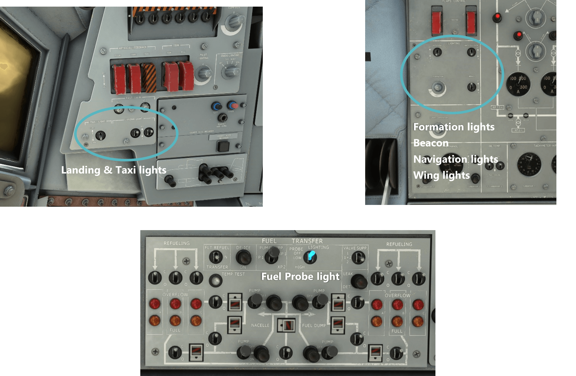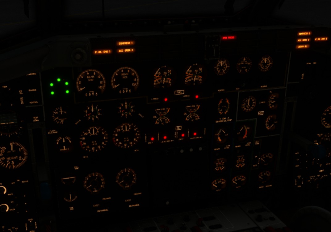 A lot of interior lights are available in the Transall. You will find knobs and switches for interior lights in several places of the cockpit. Some lights have been enhanced compared to the real aircraft (e.g. backlighting) to ensure a good readability of all the instruments by night.