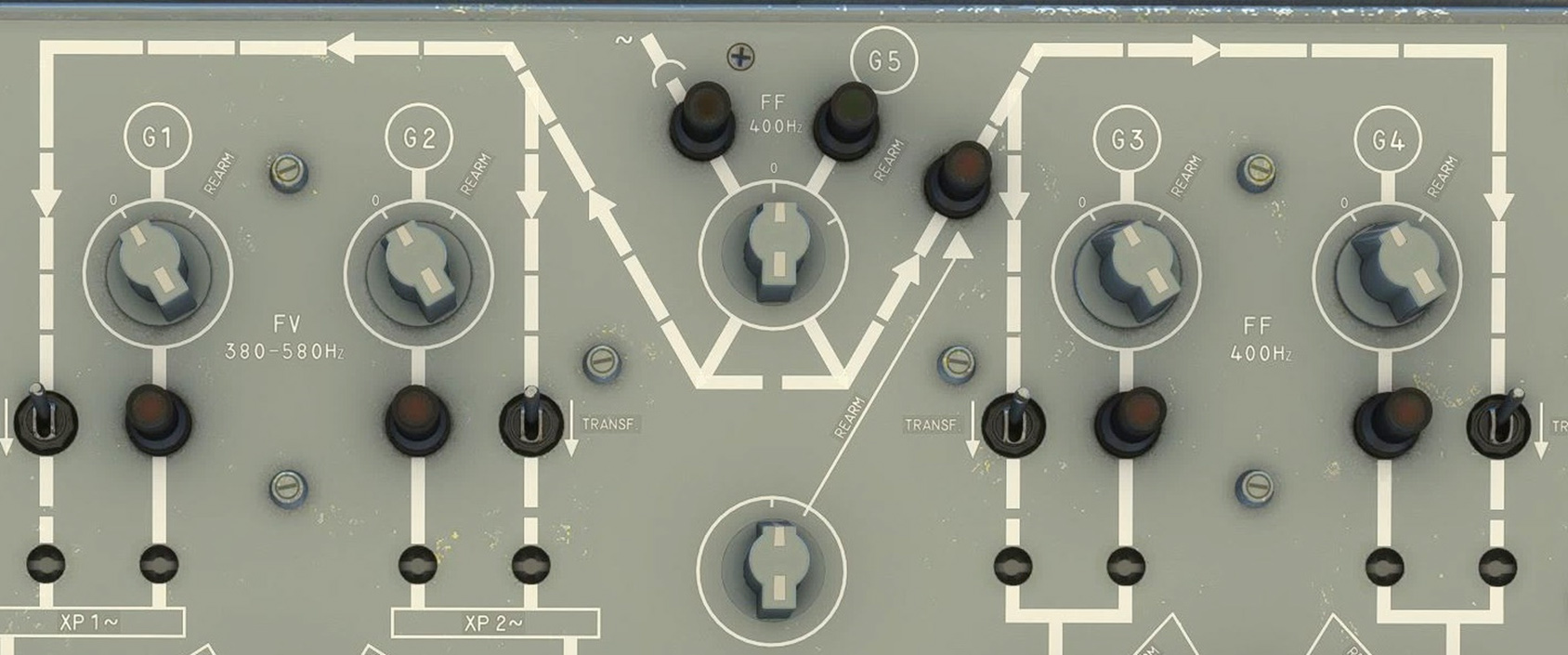 When APU nominal RPM value is reached, G5 generator is available. In this case it can be selected using GPU/G5 selector knob. A green light turns on when G5 is selected.