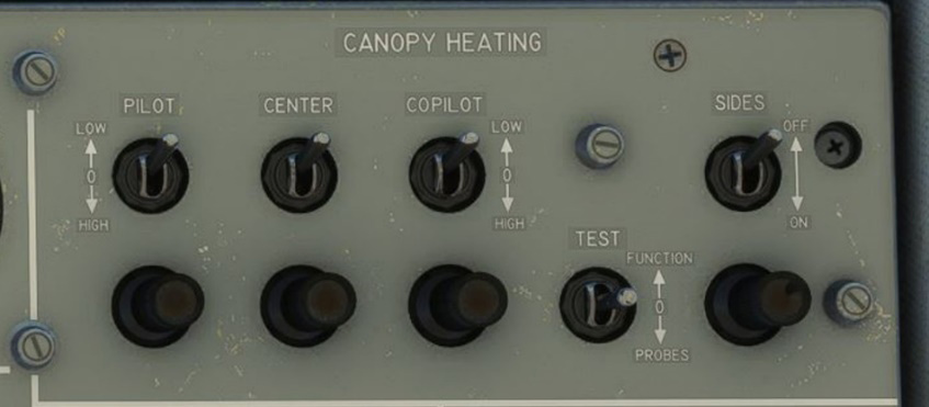 Windshield heating is divided in four zones (pilot, center, copilot and sides). Two heat intensities can be set depending on the severity of icing conditions.