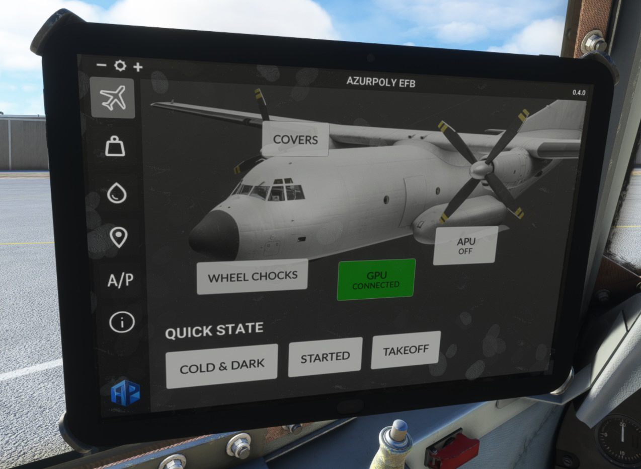 The real aircraft can also be supplied with alternating current, but both are managed with the same unit within the simulator. See electrical section for more information.