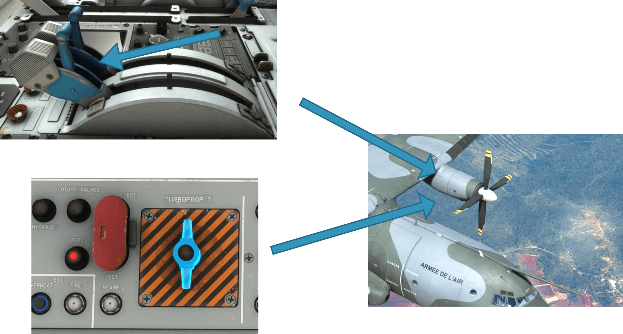 In the real aircraft, more settings are available (for example separate “on ground” and “in flight” zones for the power lever) but were simplified for usability purpose within the simulator.