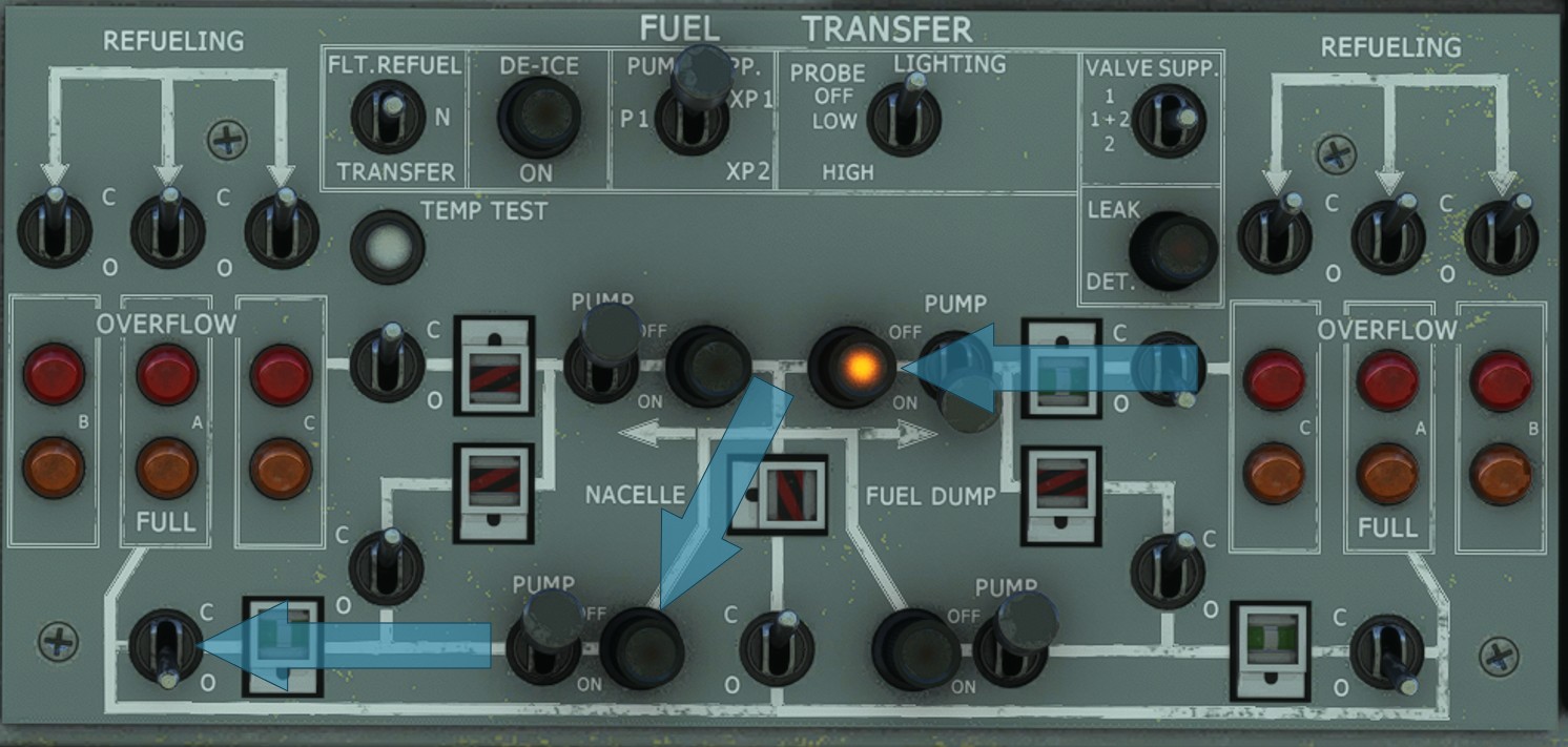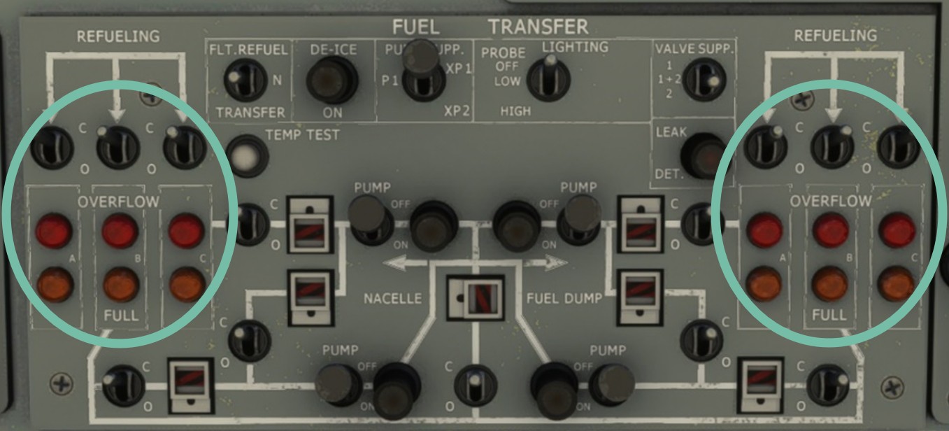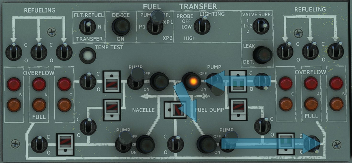 Each valve can be openeded as needed to begin a fuel transfer with the help of fuel pumps. The panel directly shows fuel pathway along transfer lines.