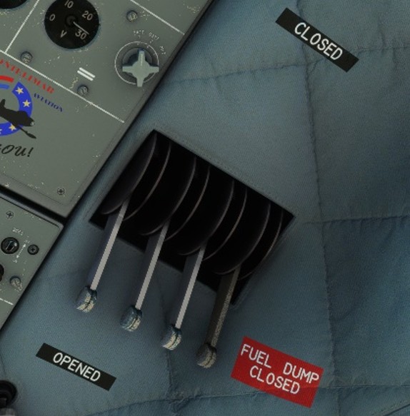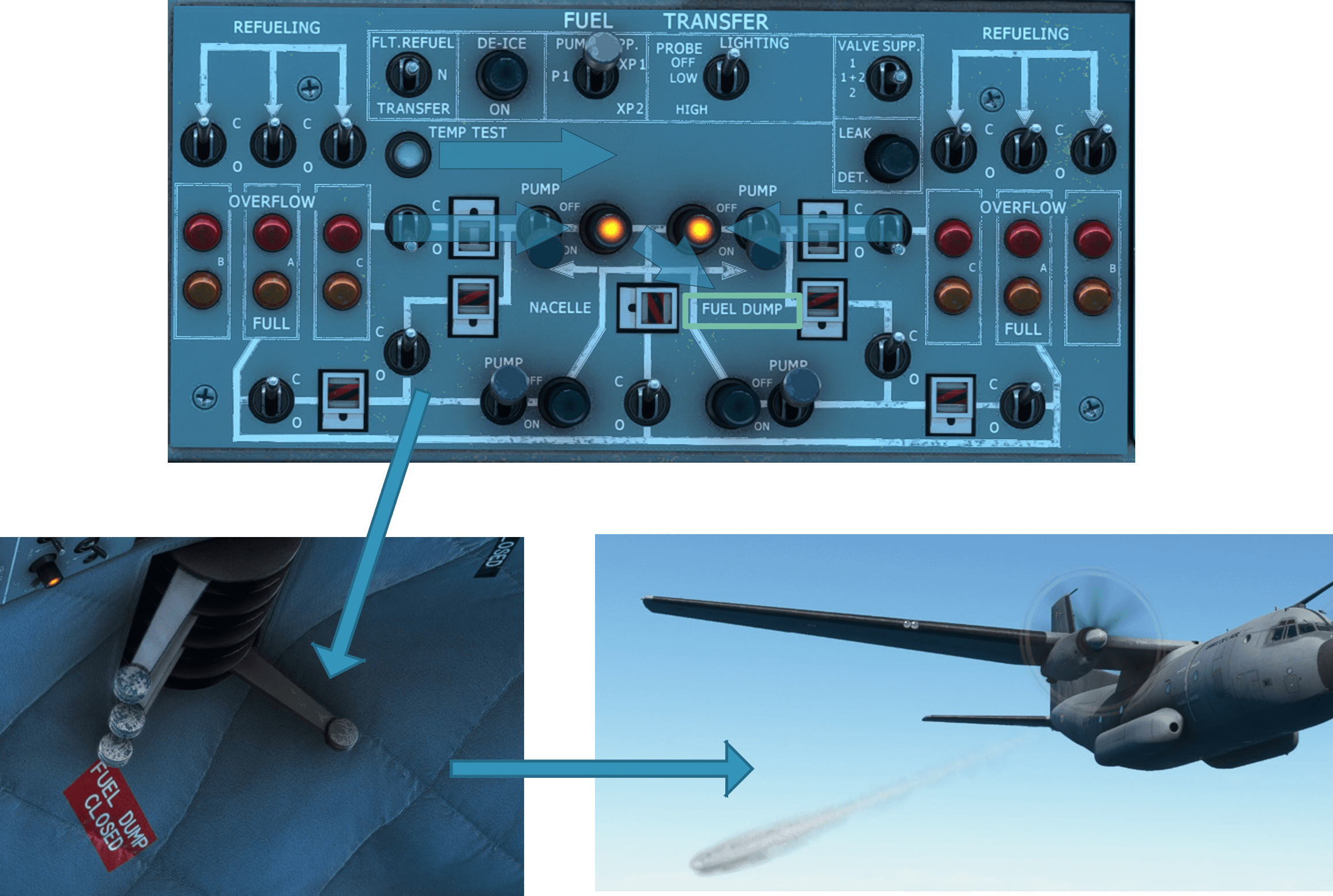 To dump fuel, valve associated to the tank to drain should be opened, and the associated pump turned on. Opening fuel dump valve handle will initiate fuel dumping.