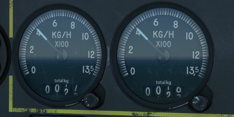 Fuel consumed by the engines can be monitored from fuel flow indicators, and can be reset with the associated knobs. Left gauge also takes into account APU fuel consumption.