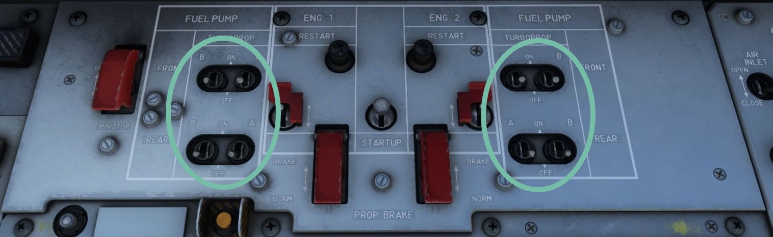 As fuel tanks are located higher than engines and APU, gravity is sufficient in most cases to feed the engines. However, in certain conditions, for example when reservoirs are near empty, you will need to use electric pumps to get enough fuel pressure. Each tank A and B has two immersed pumps, that can be controlled with their dedicated switches on the center console.
