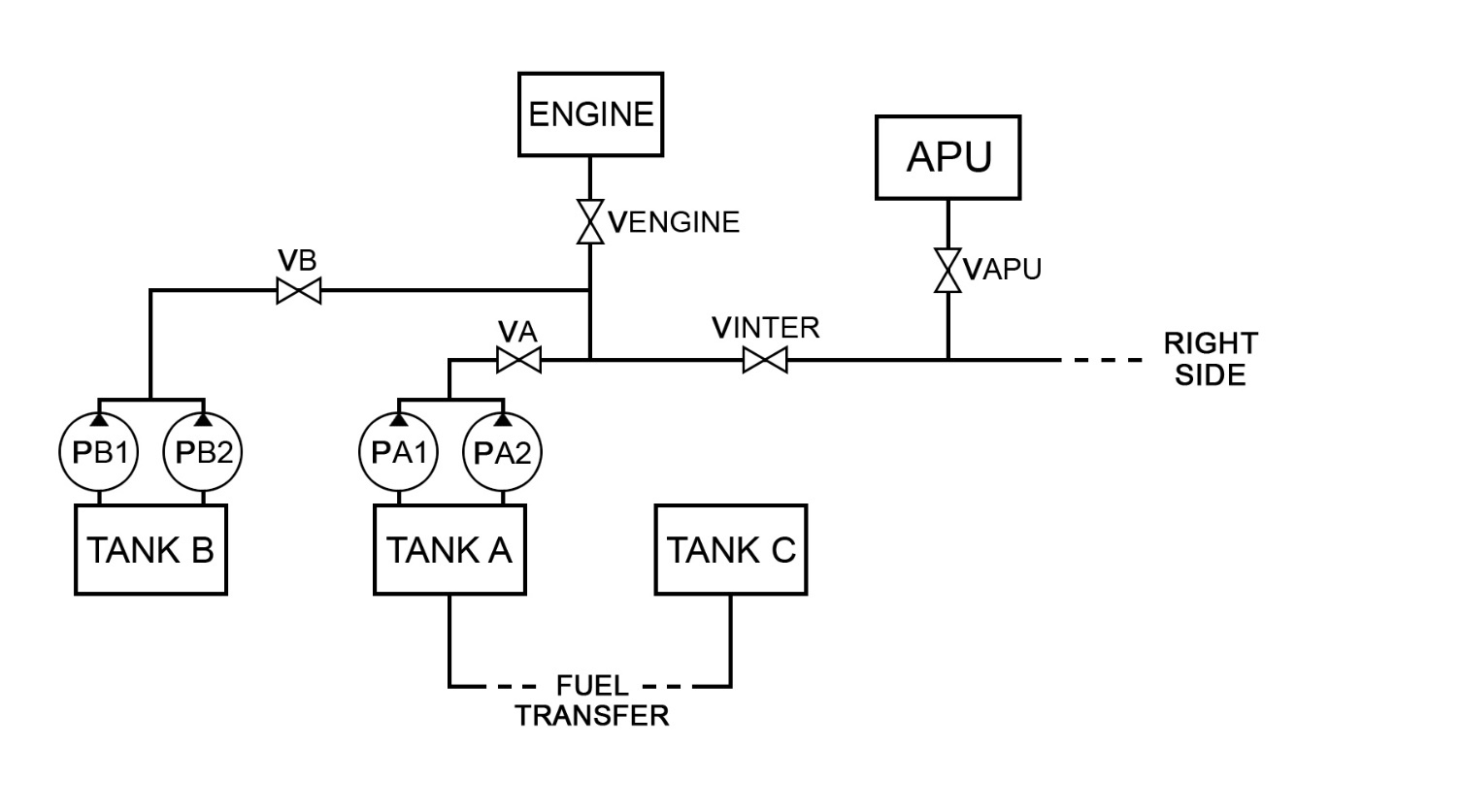 Here is a detailed diagram of fuel system with tanks, lines, valves and pumps. Only left side is depicted as fuel system is symmetrical.